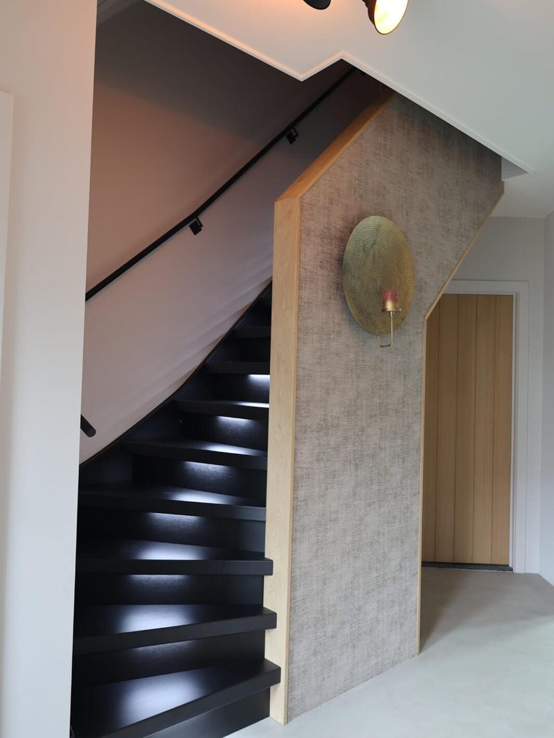 Voor deze woning hebben we een bestaande trap volledig gerenoveerd en voorzien van stijlvolle, donker houtlook overzettreden. Het strakke contrast met de witte muren geeft de trap een moderne en luxe uitstraling. Een duurzame en onderhoudsvriendelijke oplossing die perfect past in een eigentijds interieur.